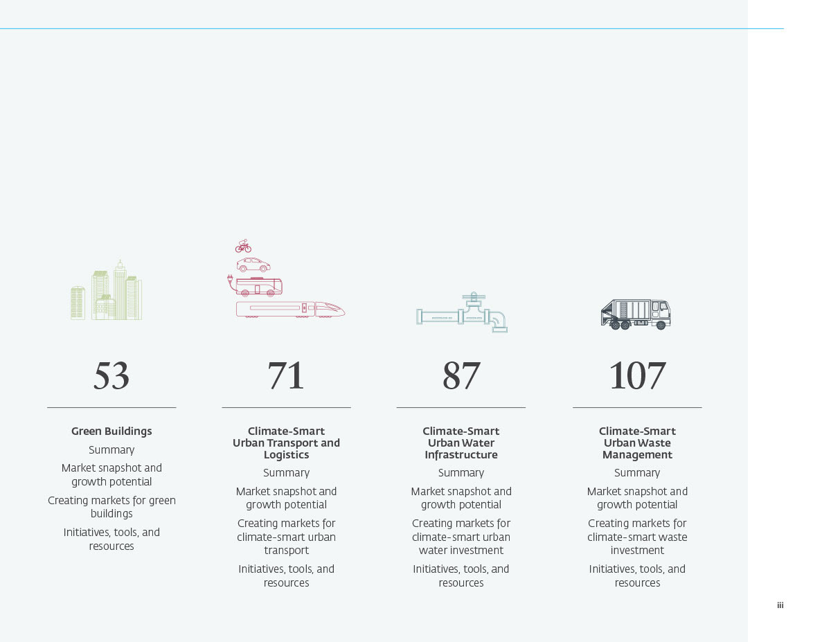 The second publication in the series, organized by climate-smart sectors. Featuring summary data, sector indicators, suggested market steps, and case studies. This publication relies on images and charts to compliment the messaging throughout.